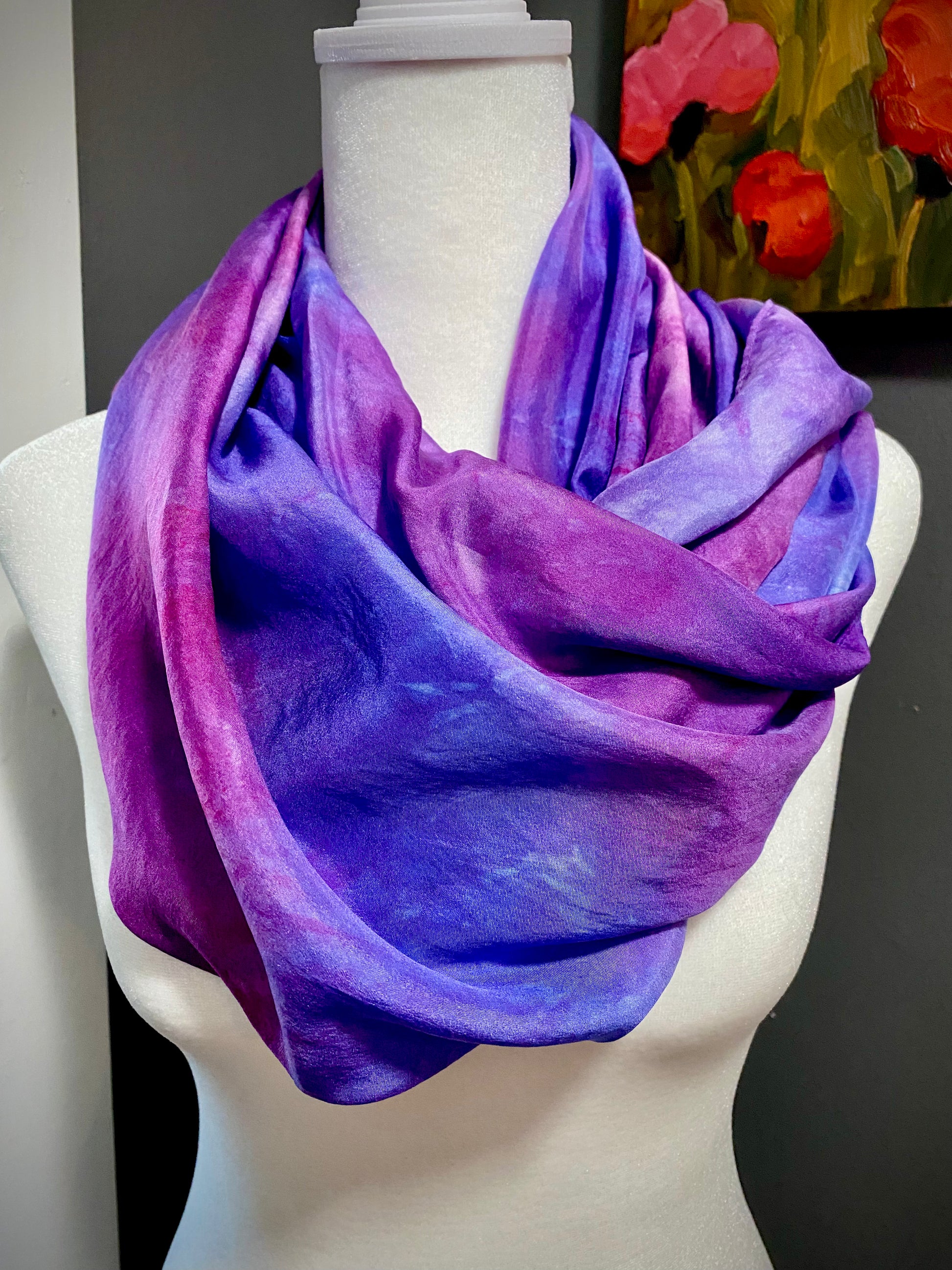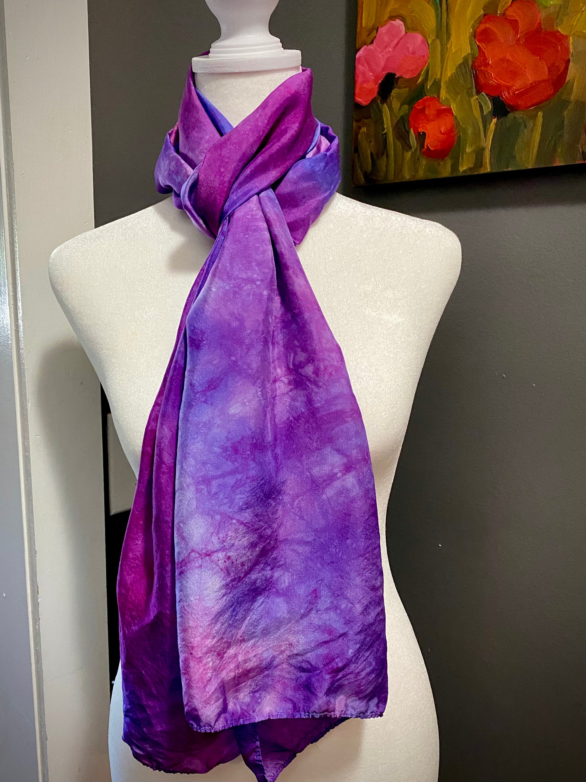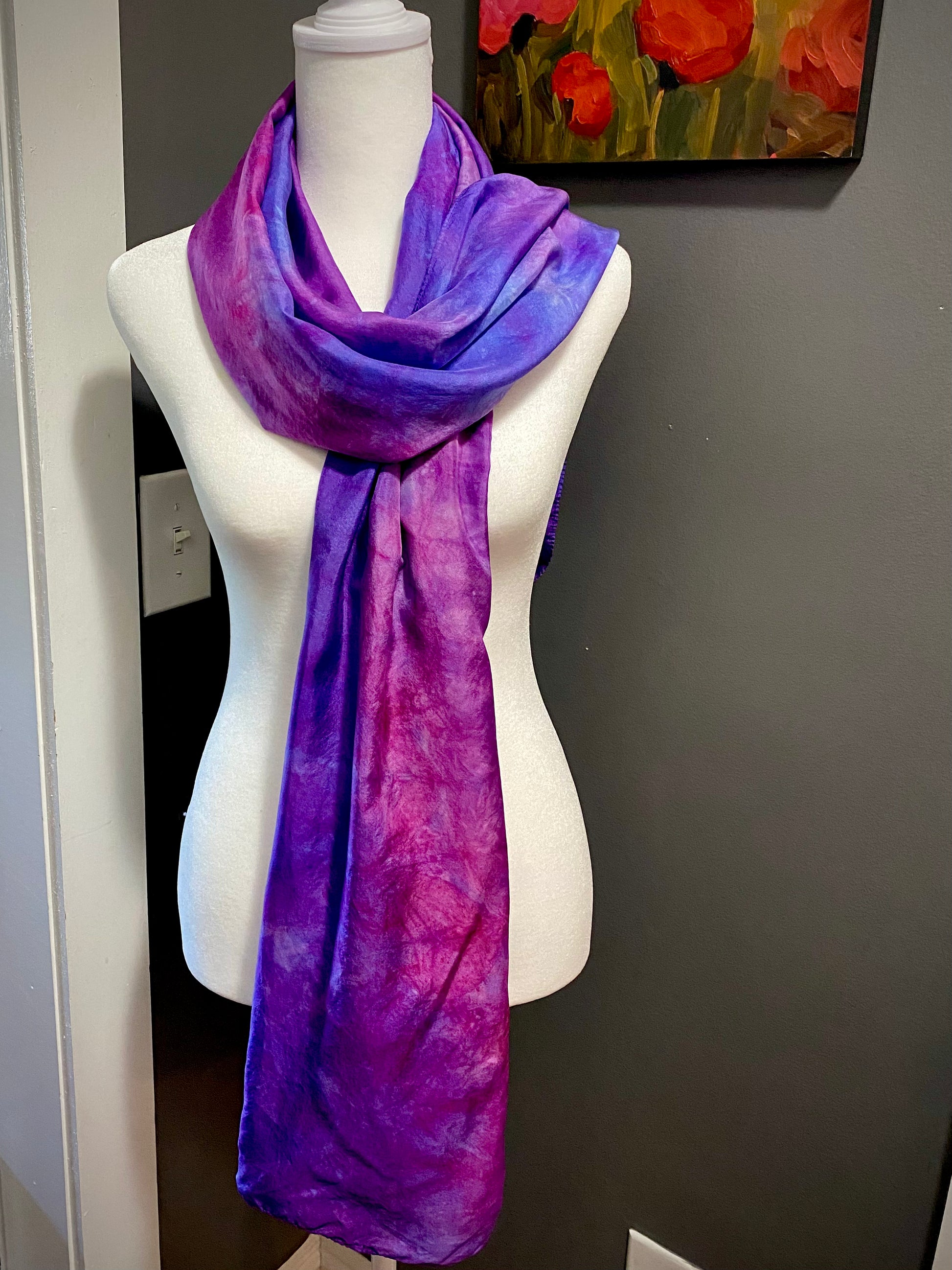 Our one of a kind 100% silk habotai scarf is hand painted in vibrant pink and purple hues. The 22x72 size is ideal to enjoy as a shawl, scarf, belt or head wrap.