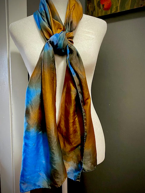 Hand Painted and Hand Dyed Silk Scarf • Blue Brown