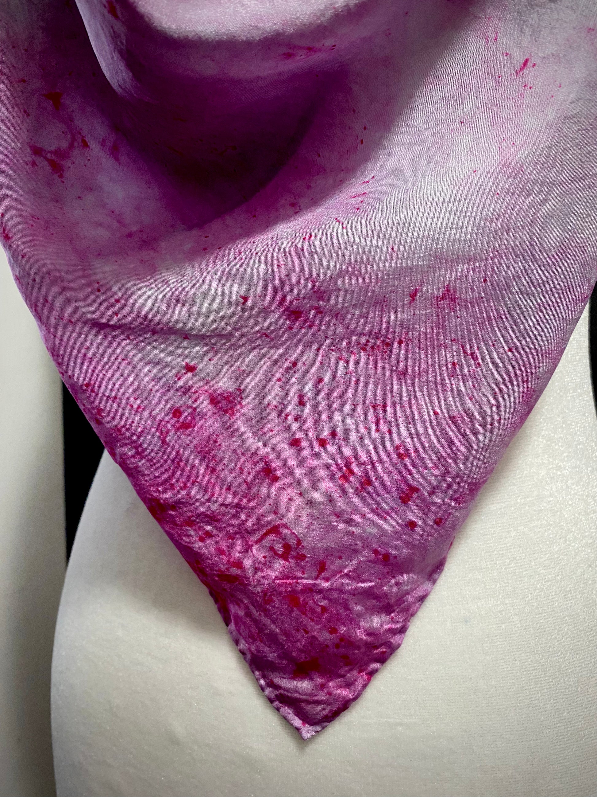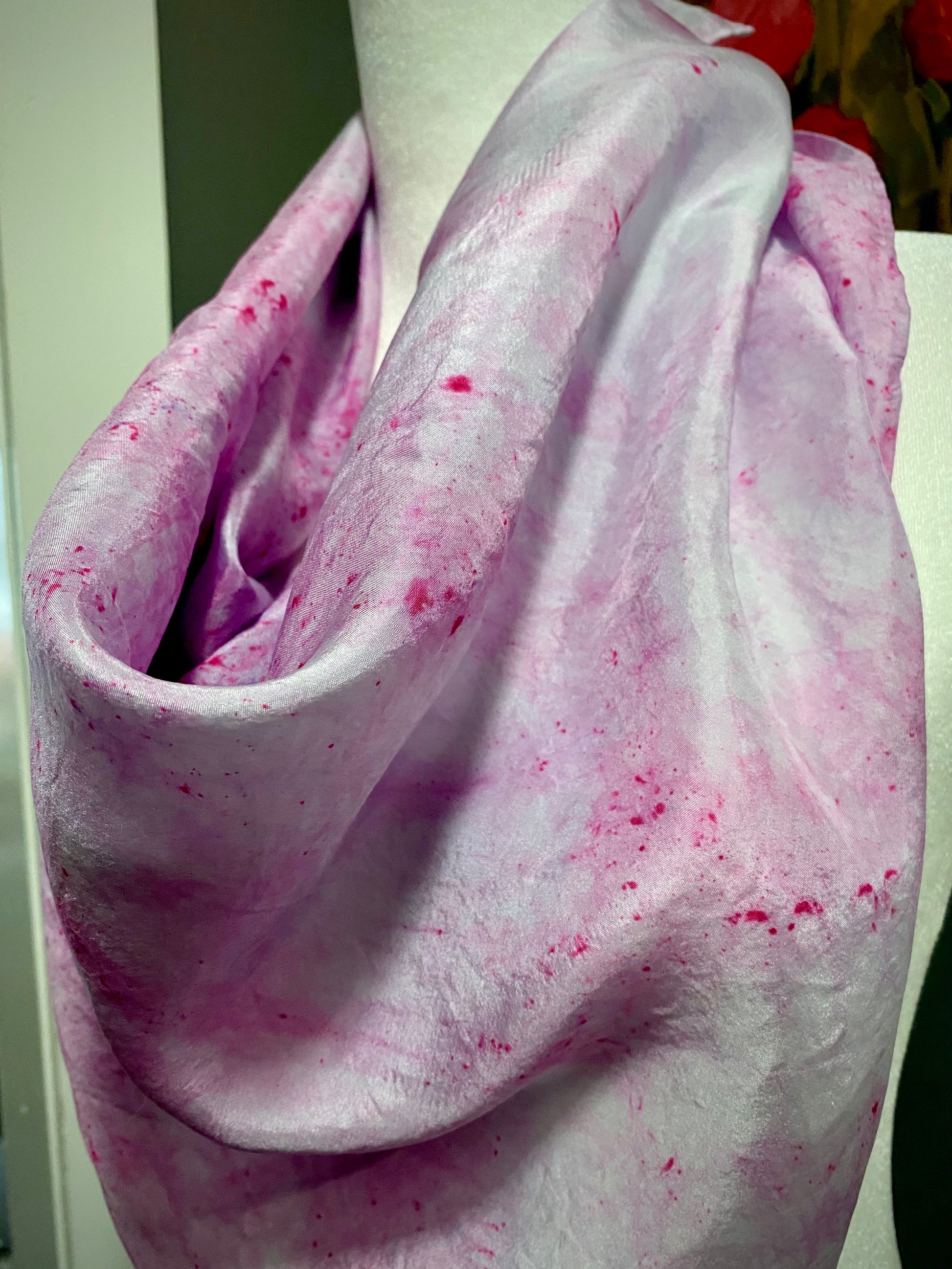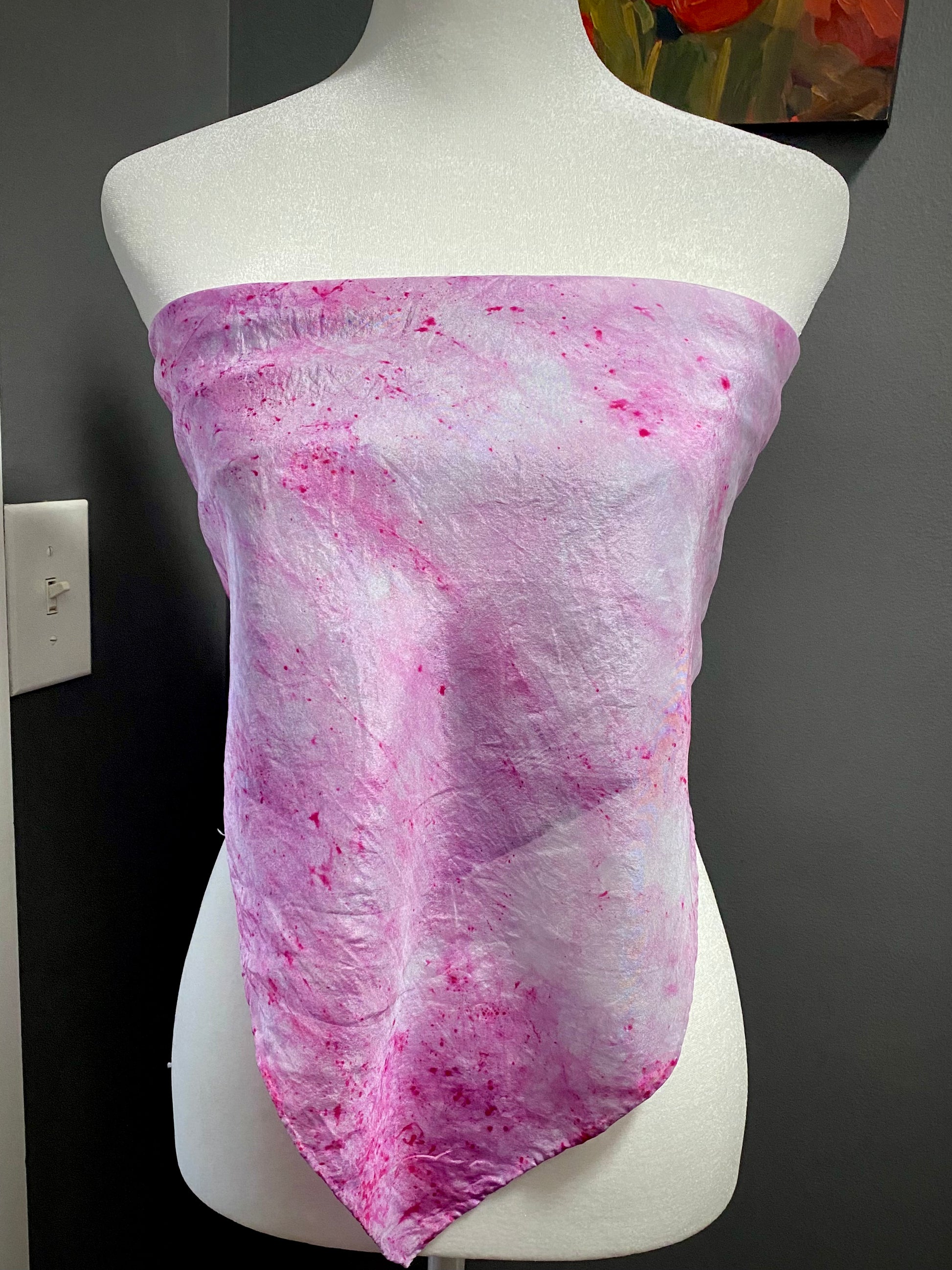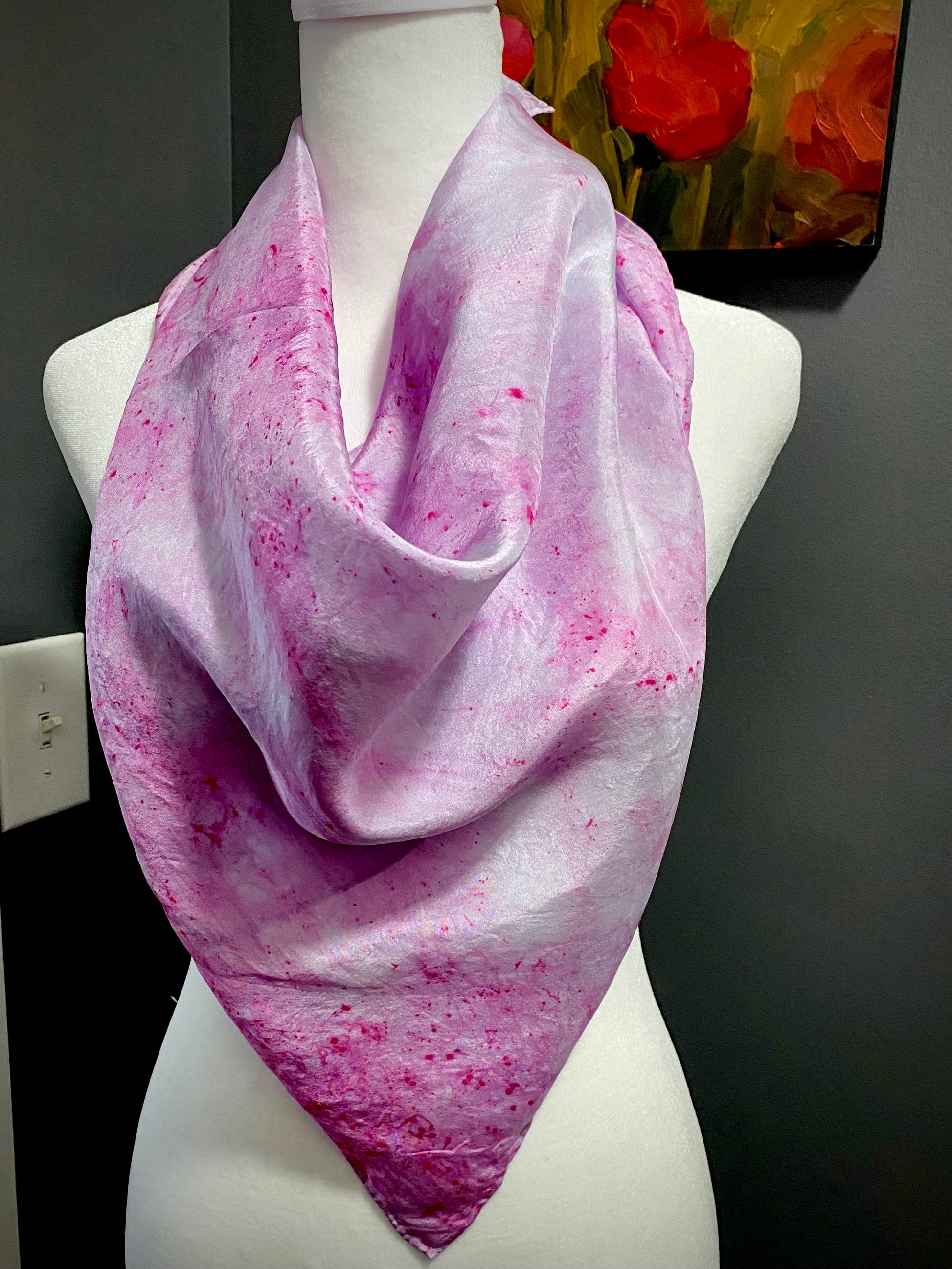 Our one of a kind 100% silk scarf is hand painted in pink and gray. The 30x30 size is ideal to enjoy as a head wrap, bandana, wristband and neckerchief. It can also be used as "Furoshiki", which is a Japanese method of wrapping gifts.