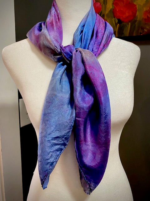 Our one of a kind 100% silk scarf is hand painted in pink and blue. The 30x30 size is ideal to enjoy as a head wrap, bandana, wristband and neckerchief. It can also be used as "Furoshiki", which is a Japanese method of wrapping gifts.
