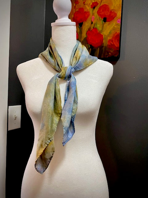 Our one of a kind 100% silk scarf is hand painted in blue and green. The 30x30 size is ideal to enjoy as a head wrap, bandana, wristband and neckerchief. It can also be used as "Furoshiki", which is a Japanese method of wrapping gifts.