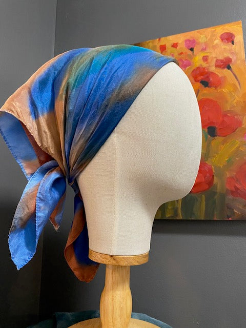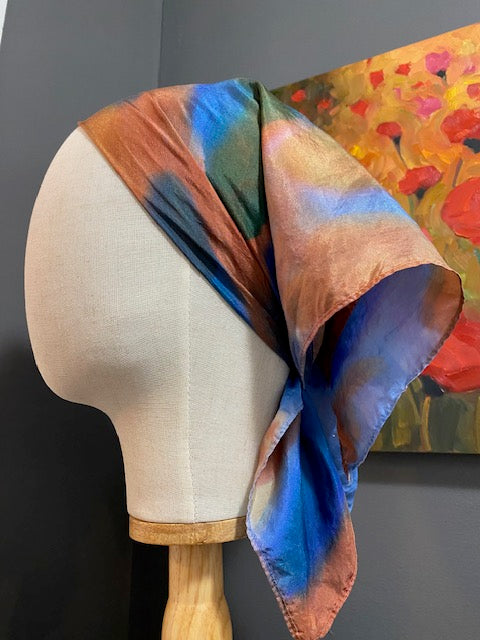 Our one of a kind 100% silk scarf is hand painted in vibrant browns and blues. The 21x21 size is ideal for use as a headband, bandana, wristband, or to add a pop of color as a neckerchief. Silk scarves have been used in Japan to wrap gifts since 710 B.C. This is known as the art of Furoshiki.