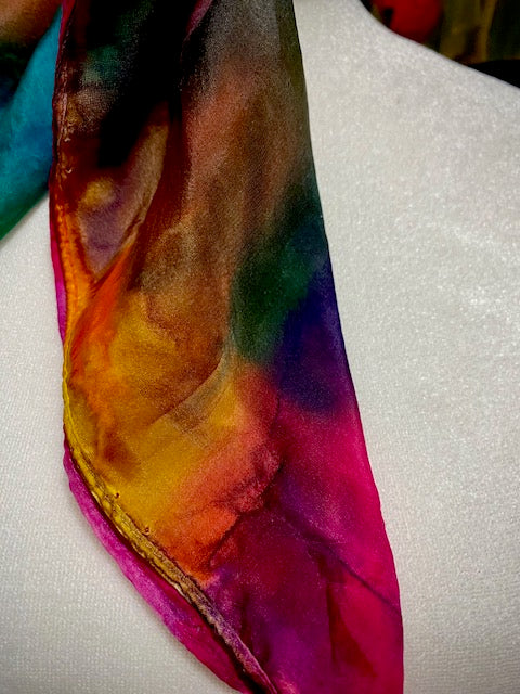 Our one of a kind 100% silk scarf is hand painted in fuchsia, purple, yellow, green and blue. The 21x21 size is ideal to enjoy as a headband, head wrap, bandana, wristband and neckerchief.